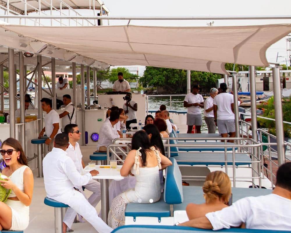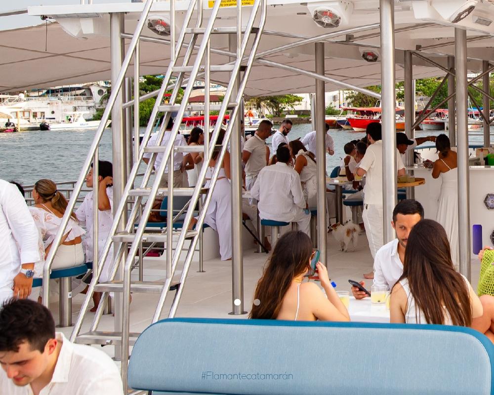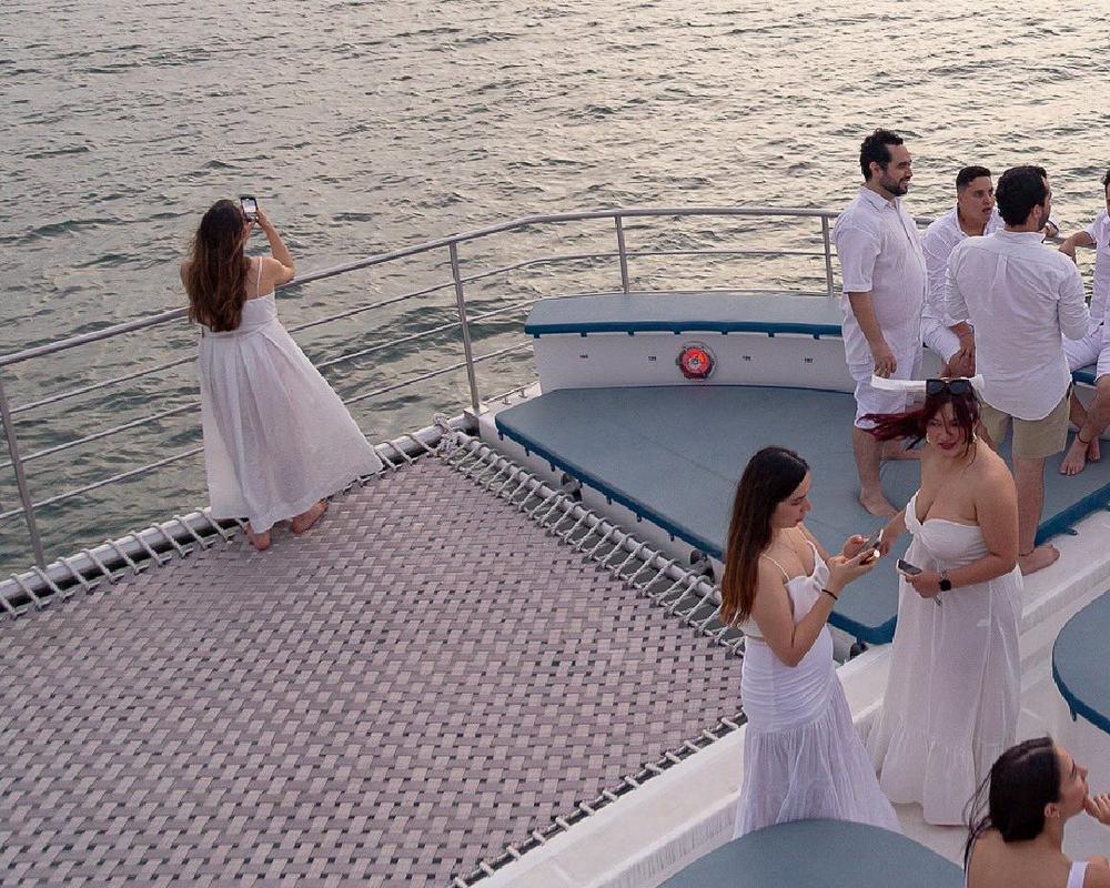 En el atardecer en crucero salimos del muelle de la Bodeguita, frente de la ciudad Amurallada de Cartagena. Navegamos entre los rascacielos de Manga y Bocagrande. Posteriormente, navegamos entre Isla Manzanillo y Castillo Grande. Llegamos delante de El Laguito y la isla Tierra Bomba, donde la bahÃa se abre al mar. Aquà abrimos las velas y disfrutamos de la magnÃfica puesta de sol mientras navegamos silenciosamente a vela. Poco a poco las luces de los rascacielos van iluminándose.