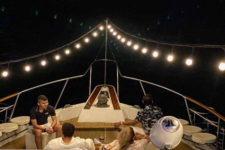 Mientras navegamos por la bahÃa de regreso a Cartagena, podréis contemplar el paisaje nocturno o bailar al ritmo de la música para despedir la noche por todo lo alto.